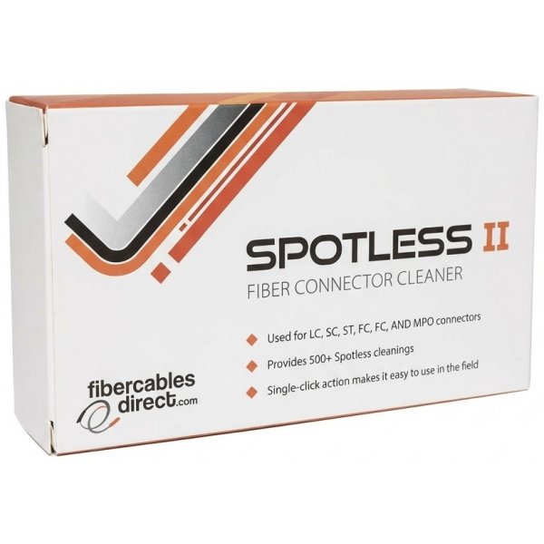 2Pk Spotless II Fiber Optic Connector Cleaning Box with over 500 cleanings per box.  Clean the fiber core tip in LC, SC, ST, FC, MU & MPO type fiber optic cable connectors.  This easy to use, long lasting, single click action fiber tip cleaner is an essential to maintaining the highest quality fiber contact. Non-alcohol, high fiber count tape effectively cleans a variety of contaminates.