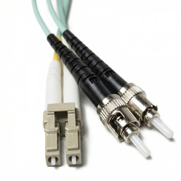 OM3 LC ST 10Gig Multimode Duplex 50/125 Fiber Patch Cables (10Gb up to 300 meters). Terminated with ceramic ferrule LC connectors and stainless steel ferrule ST connectors. Aqua zip-cord fiber jumper cable with 2.0mm outer diameter PVC OFNR Riser Rated jacket.