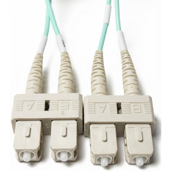 OM3 SC to SC 10Gb 50/125 Multimode Duplex fiber cables.  Terminated with ceramic 2.5mm ferrule SC connectors, this high bandwidth 10Gig multimode cable has Corning optical fiber glass for high speed, low loss, data transmission.  A high quality, aqua colored, 3.0mm thick outer diameter, PVC fiber jumper with zip-cord.